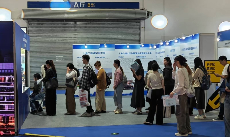 上海市曹杨第二中学、上海市曹杨第二中学东校的招聘摊位前,人头攒动。曹杨第二中学东校是基于曹杨第二中学时代发展打造的创新学校,以AI教育为特色,构建面向未来的智慧课程新范式。“我们青睐的应聘人员更多元,不仅看重求职者各方面的适应能力,包括从教经历、与学生互动等,如果有相关学科竞赛获奖经历、具备AI素养的求职者,更受欢迎。后期,学校还将对相关学科老师进行AI方面的培训。”人事负责人郭老师说。