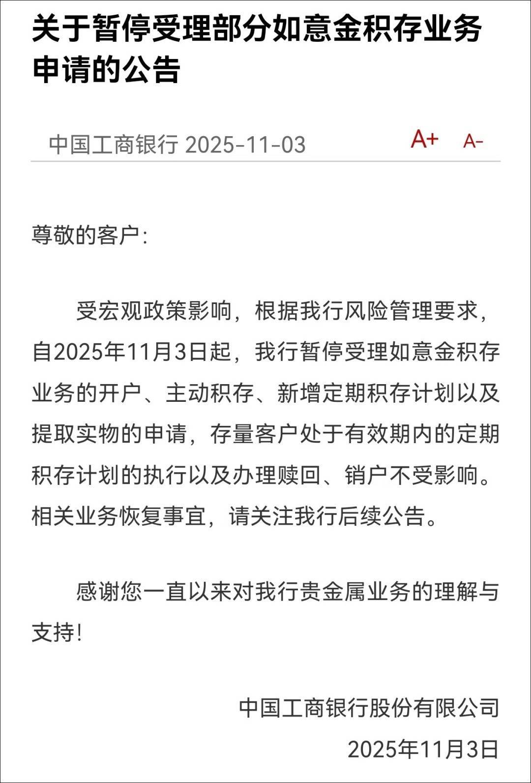 今天一早,工商银行发出了《暂停受理部分如意金积存业务申请的公告》,公告说,受宏观政策影响,根据我行风险管理要求,自2025年11月3日起,我行暂停受理如意金积存业务的开户、主动积存、新增定期积存计划以及提取实物的申请,存量客户处于有效期内的定期积存计划的执行以及办理赎回、销户不受影响。