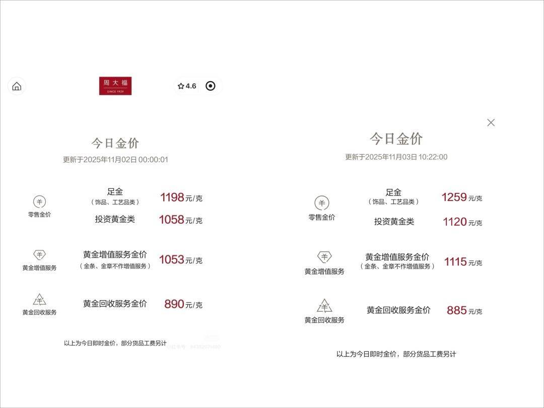今天,周大福饰品和投资类黄金的报价从昨天的1198元/克和1058元/克,分别上调至1259元/克和1120元/克。