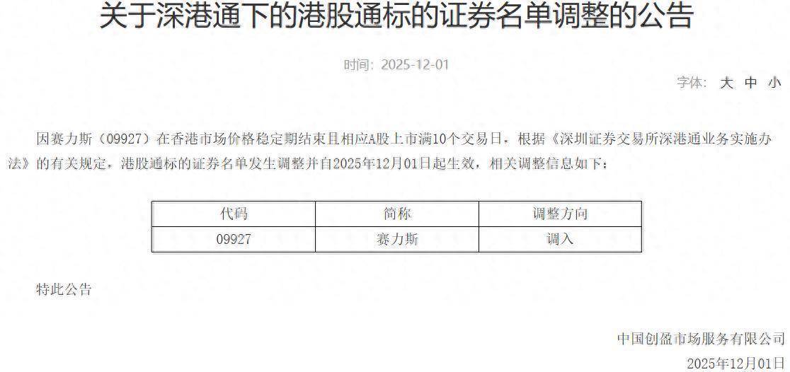 智通财经APP获悉,深交所公告,因赛力斯(09927)在香港市场价格稳定期结束且相应A股上市满10个交易日,根据《深圳证券交易所深港通业务实施办法》的有关规定,港股通标的证券名单发生调整并自2025年12月01日起生效,调入赛力斯。